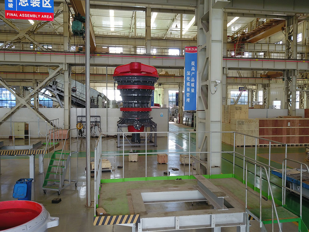 The working principle of GP300 cone crusher mainly relies on laminated crushing technology, which crushes materials through the squeezing and shearing action between the fixed cone and the moving cone. After the device is started, the motor drives the transmission shaft to rotate, driving the movable cone to perform eccentric rotation within the fixed cone. The material is fed into the cavity from the top of the crusher, and as the moving cone rotates, the material is squeezed layer by layer between the two cones, thereby achieving crushing. During the crushing process, the eccentric rotation of the moving cone generates a strong crushing force, and the material is subjected to multiple compressions, bending, and shearing until it is crushed to the appropriate particle size and discharged from the discharge port. To ensure the uniformity of the discharge particle size, GP300 is equipped with an automatic adjustment device that can monitor and adjust the position of the moving cone in real time through the control system to maintain the appropriate gap and ensure that the discharge size meets the expected requirements. In addition, GP300 also adopts a hydraulic system, which facilitates the cleaning operation and overload protection of the equipment. When unbreakable materials enter the crushing chamber, the hydraulic system will automatically increase the pressure, lift the moving cone to avoid damaging the equipment, and then resume normal operation. This design greatly improves the reliability and safety of the equipment, reduces downtime caused by material blockage, and thus enhances overall production efficiency.